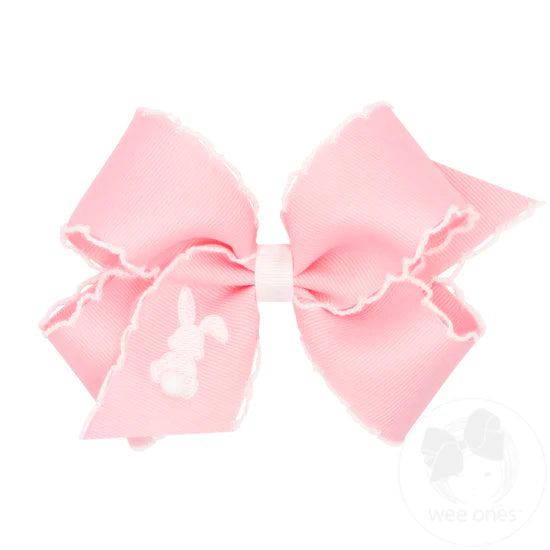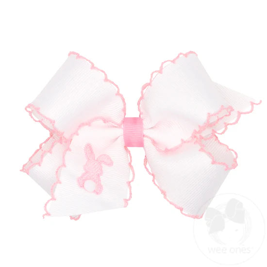 Full of spring sweetness, this moonstitch edge bow features charming Easter embroidery on crisp white grosgrain with your choice of light pink or light blue edging. With cheerful stitched designs and sizes in Medium or King, it’s the perfect way to dress up her spring outfits, Easter baskets, egg-hunt looks, and every hop-happy moment of the season. This bow is sure to stay in her hair all day with our patented WeeStay™ no-slip hair clip.